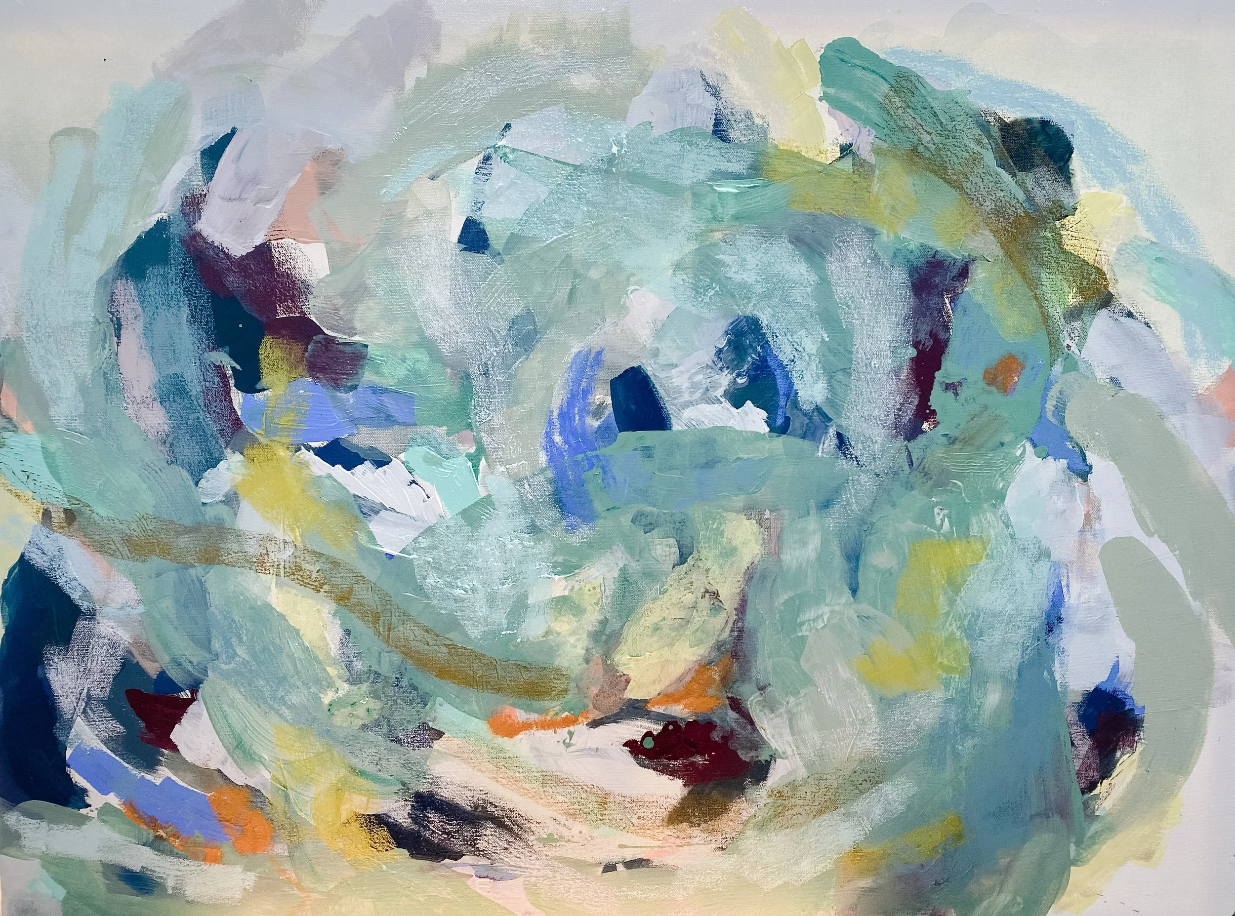 40” x 30” original mixed media painting on stretched canvas. This piece was commissioned for a living room. The palette was inspired by the space – vibrant, coastal, and feminine.